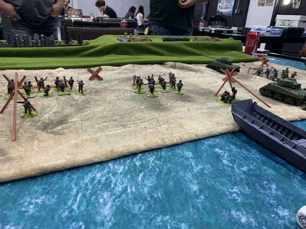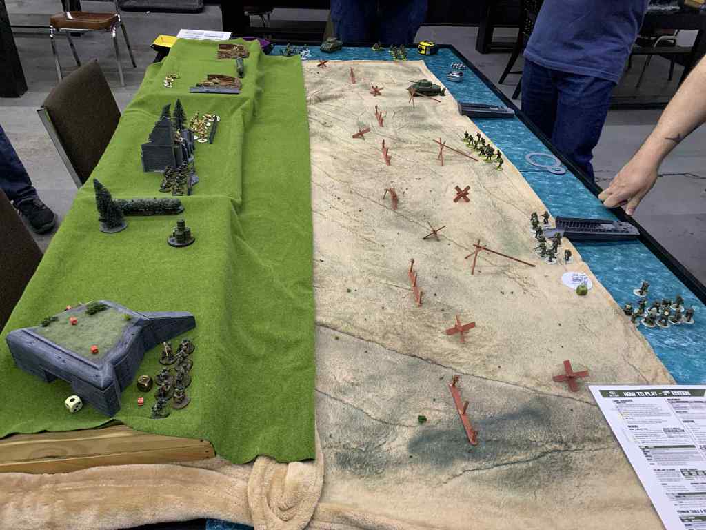At 3 players per side, this was our biggest single game of Bolt Action, and it came down to quite the nail biter. Allied forces, despite some early successes with offshore artillery and the support of multiple tanks, bogged down crossing the final stretch of beach.